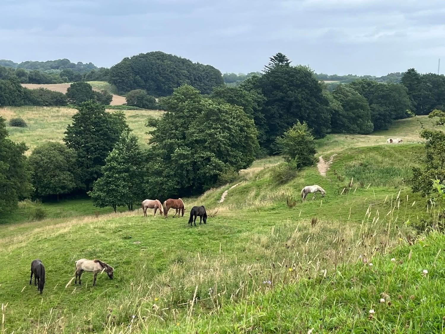 Vores hoppefolde er mellem 3 og 8 ha. Vi har nogle stykker, som vi skifter imellem afhængigt af græs og vandmængden. Vores hoppefolde har forskellige grader af kuperet terræn, men vandes med ridende fra å-løb langs foldene.